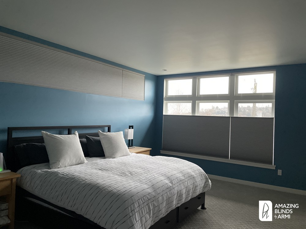 It was time for our clients to upgrade the window coverings in their primary bedroom to motorized, room-darkening shades with top-down/bottom-up functionality in Seattle, WA. One challenge was the large dimensions of the windows. We installed Hunter Douglas Duette® Architella® shades with PowerView® Automation, configured asymmetrically to fit the window openings. These shades addressed their goals for convenient operation, privacy, light control, and maintaining the view. The fabric beautifully complements the freshly repainted room, and the addition of the Gateway allows seamless integration with their devices, making it a perfect fit for a smart home.