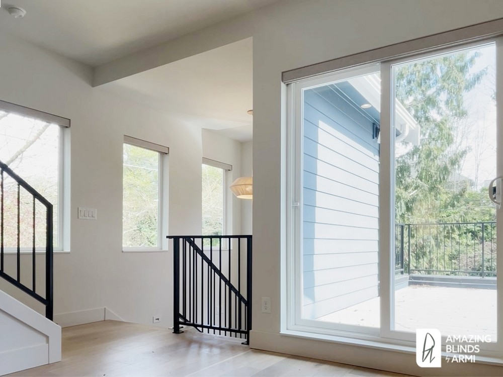This new townhome in Seattle’s Magnolia neighborhood needed a modern window treatment that complemented its clean architectural lines. We installed Hunter Douglas roller shades with PowerView® Automation, a strong choice for homeowners looking for a minimalist profile, smooth operation, and reliable light control. With virtually no stack when raised, these automated roller shades keep the architecture unobstructed while providing reliable light control and privacy. The motorized system provides convenient automation, making it easy to manage privacy, glare reduction, and natural light with a simple tap. The result is a streamlined, functional, and contemporary window covering solution that supports everyday living and fits the home’s overall design.